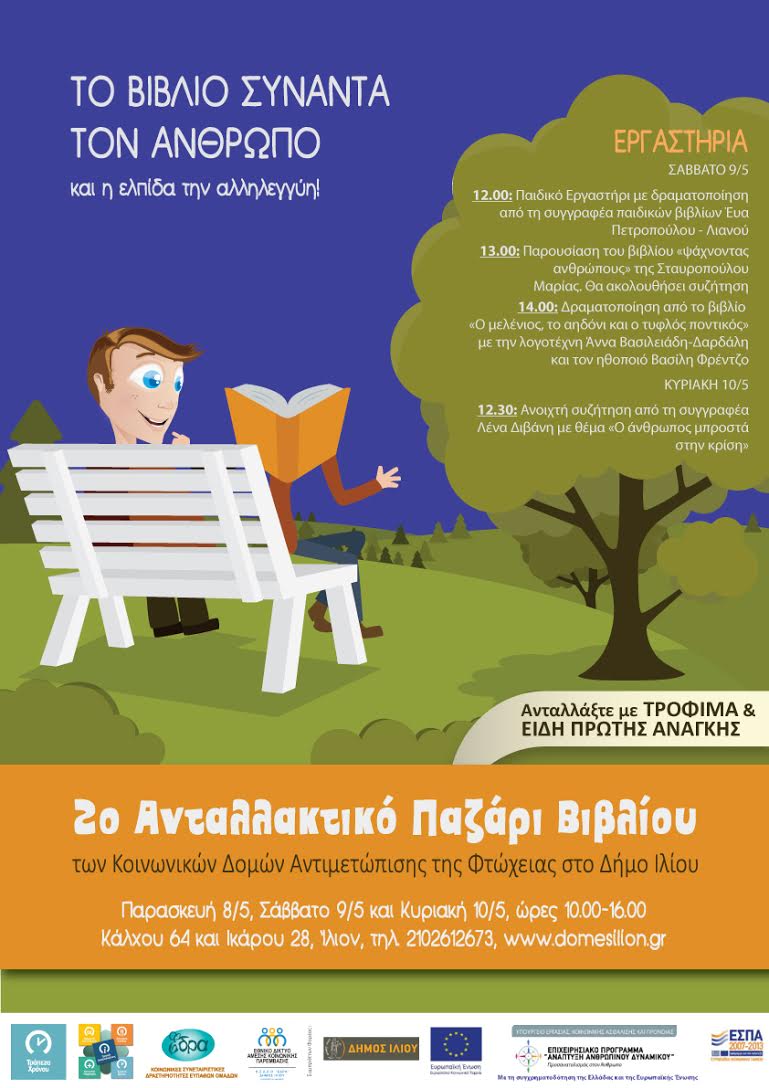 H Τράπεζα Χρόνου των Κοινωνικών Δομών Άμεσης Αντιμετώπισης της Φτώχειας στο Δήμο Ιλίου διοργανώνει το2o Ανταλλακτικό Παζάρι Βιβλίου στις 8, 9 & 10 Μαΐου από τις 10:00 έως τις 16:00, στο κτήριο των Κοινωνικών Δομών, Ικάρου 28 & Κάλχου 64 στο Ίλιον.