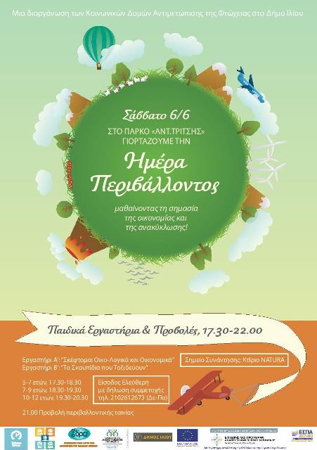 Το Σάββατο 6 Ιουνίου, η Τράπεζα Χρόνου των Κοινωνικών Δομών Άμεσης Αντιμετώπισης της Φτώχειας στο Δήμο Ιλίου, διοργανώνει μία εκδήλωση για τη Διεθνή Ημέρα Περιβάλλοντος στο Πάρκο Περιβαλλοντικής Ευαισθητοποίησης «Αντώνης Τρίτσης» στο Ίλιον. Στην εκδήλωση έχουν προγραμματιστεί εκπαιδευτικά-δημιουργικά προγράμματα για παιδιά που προάγουν την περιβαλλοντική και οικονομική συνείδηση, ενώ μετά το τέλος των εργαστηρίων στις 21.00 θα γίνει προβολή ταινίας με θεματολογία σχετική με το περιβάλλον: