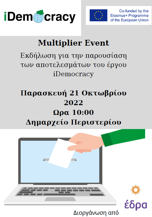 Στα πλαίσια του Ευρωπαϊκού Έργου "IDemocracy (Training Programme for Promoting the Exercise of Democratic Rights of Persons with Intellectual Disabilities in the Digital Society)", ο φορέας ΚΣΔΕΟ "ΕΔΡΑ" διοργανώνει Συνέδριο, την Παρασκευή 21 Οκτωβρίου 2022 και ώρα 10.00, στο Αμφιθέατρο του Δημαρχείου Περιστερίου. Το Συνέδριο έχει ως στόχο την παρουσίαση των αποτελεσμάτων του έργου στους ενδιαφερόμενους φορείς.