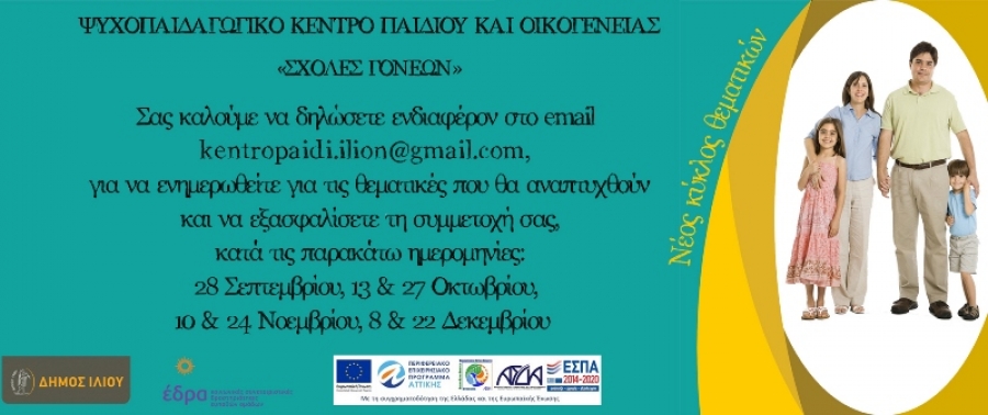 Το Ψυχοπαιδαγωγικό Κέντρο Παιδιού και Οικογένειας, στα πλαίσια του έργου «Πολλαπλή Στήριξη του Παιδιού και της Οικογένειας» του Δήμου Ιλίου σε συνεργασία με τον Κοινωνικό Φορέα ΚΣΔΕΟ «ΕΔΡΑ», στην προσπάθεια να ανταποκριθούν στην μεγάλη κοινωνική ανάγκη για την στήριξη των γονέων, ώστε να μπορούν να ανταποκριθούν με επιτυχία στο σύνθετο και δύσκολο ρόλο τους, λειτουργεί «Σχολή Γονέων».