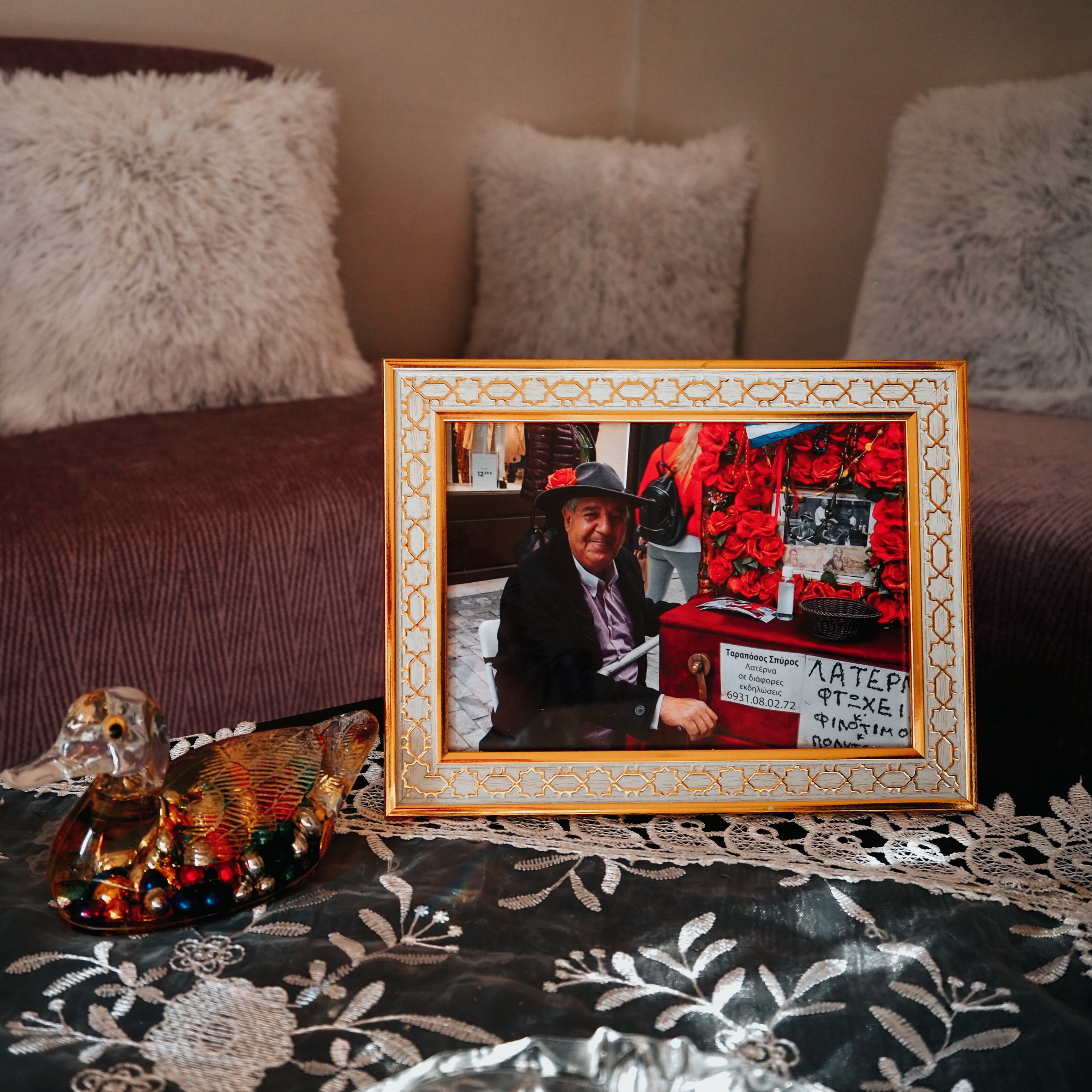 Το ραντεβού μας ήταν το πρωί γύρω στις δέκα και ενώ πλησιάζαμε στο σπίτι, αντικρίσαμε το καλόκαρδο χαμόγελο του κ. Σπύρου που μας περίμενε από νωρίς στην αυλή για να μας καλωσορίσει. Ένας άνθρωπος ανοιχτός με ζεστασιά που καθημερινά γεμίζει μουσική με την Λατέρνα του, μερικούς από τους πιο κεντρικούς δρόμους της πόλης. Την ίδια στιγμή η γυναίκα του όπως την αποκαλεί, η κα. Ευδοξία, γεμάτη ενέργεια και ένα πηγαίο συναισθήμα αγάπης είχε ετοιμάσει κεράσματα, καλωσορίζοντάς μας με τον δικό της τρόπο.