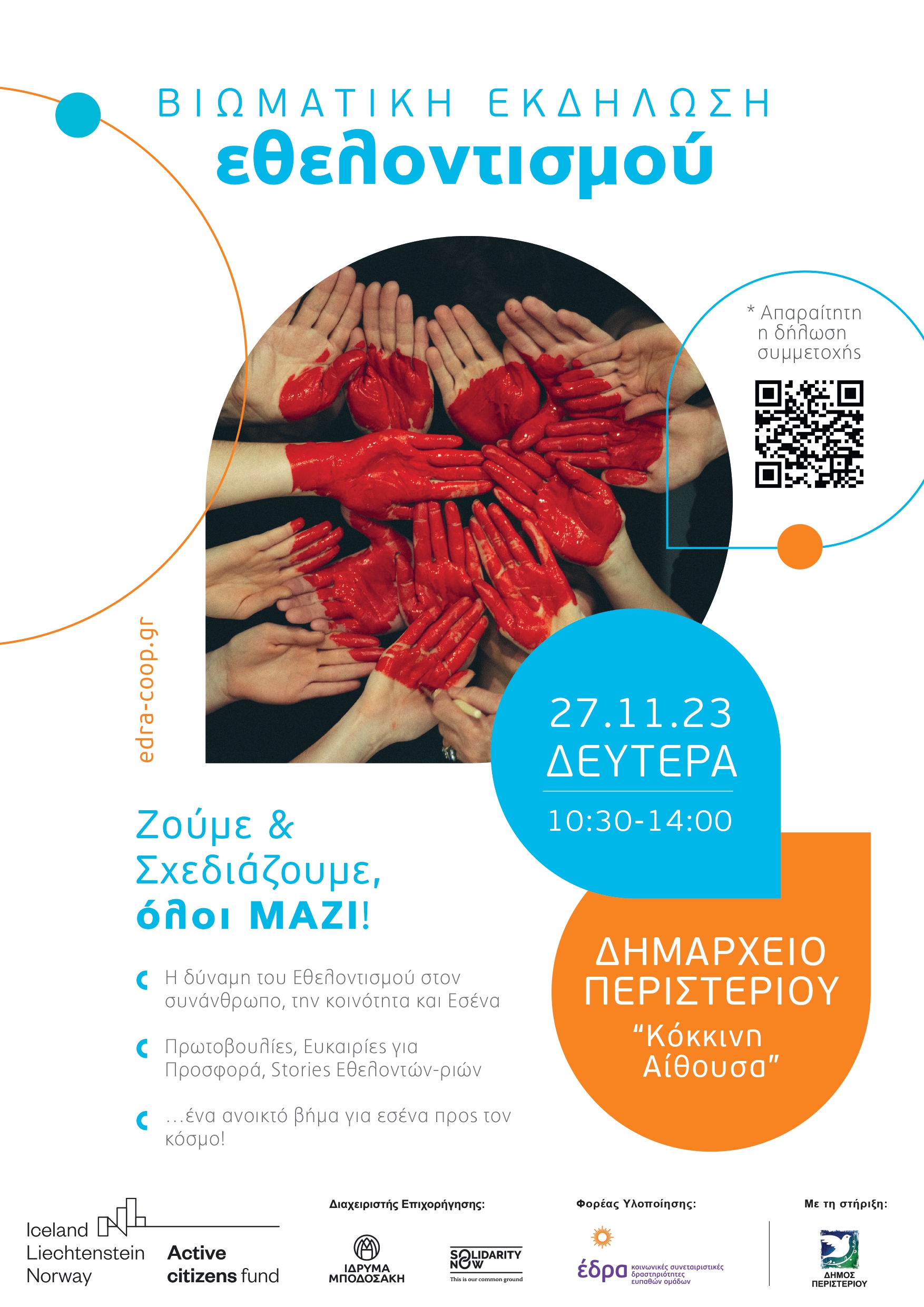 Η εκδήλωση πραγματοποιείται ως επιμέρους δράση του έργου «Στο επίκεντρο ο άνθρωπος», που υλοποιείται στο πλαίσιο του προγράμματος Active citizens fund, με φορέα υλοποίησης τον οργανισμό Κ.Σ.Δ.Ε.Ο. «ΕΔΡΑ».