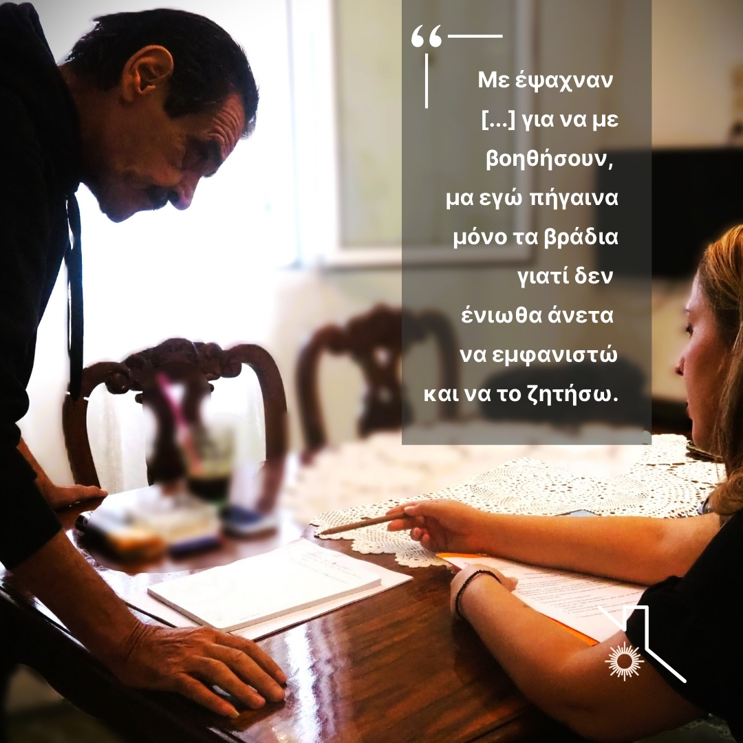 Πήγαινα βλέπετε τα βράδια και κοιμόμουν εκεί για αρκετό καιρό. Μία ημέρα πήγα τυχαία για να φτιάξω ένα χαρτί στον Δήμο και με αναγνώρισαν από τα βίντεο του χώρου. Με έψαχναν όπως μου είπαν όλο αυτό το διάστημα για να με βοηθήσουν, μα εγώ πήγαινα μόνο τα βράδια γιατί δεν ένιωθα άνετα να εμφανιστώ και να το ζητήσω.