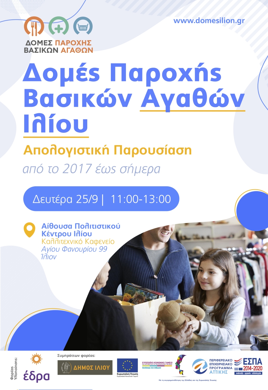 Σας προσκαλούμε στην απολογιστική παρουσίαση του έργου των Δομών Παροχής Βασικών Αγαθών Δήμου Ιλίου από το 2017 έως σήμερα.