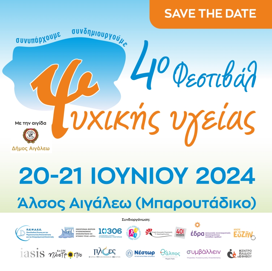 Στις 20 & 21 Ιουνίου 2024 με την υποστήριξη και αιγίδα του Δήμου Αιγάλεω η ΠΕΨΑΕΕ – μαζί με πληθώρα φορέων ψυχικής υγείας και της "ΕΔΡΑ" θα αναβιώσουν το θεσμό του Φεστιβάλ Ψ για τον αποστιγματισμό της ψυχικής υγείας με τη διοργάνωση του 4ου Φεστιβάλ Ψ στη Δυτική Αθήνα, στο Άλσος Αιγάλεω.