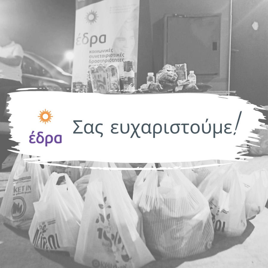 Η Κ.Σ.Δ.Ε.Ο. «ΕΔΡΑ» στις 13 Σεπτεμβρίου, συμμετείχε ενεργά στο έκτακτο κάλεσμα της Περιφέρειας Αττικής με σκοπό τη συλλογή ειδών πρώτης ανάγκης - τροφίμων μακράς διαρκείας και υγειονομικού υλικού - για την ανακούφιση των συνανθρώπων μας, στην περιοχή της Θεσσαλίας που επλήγησαν από τις πρόσφατες πλημμύρες, στις αρχές του μήνα.