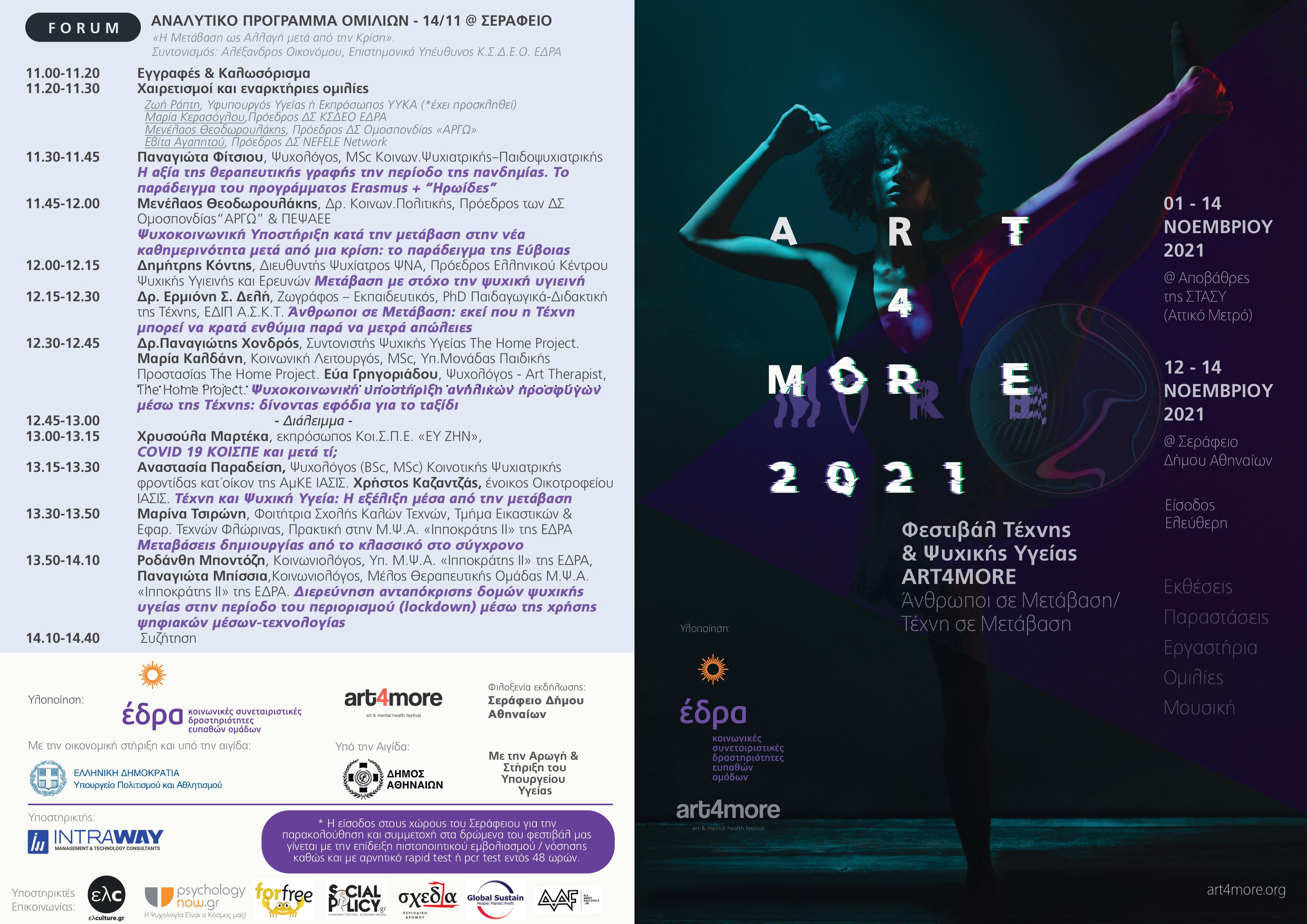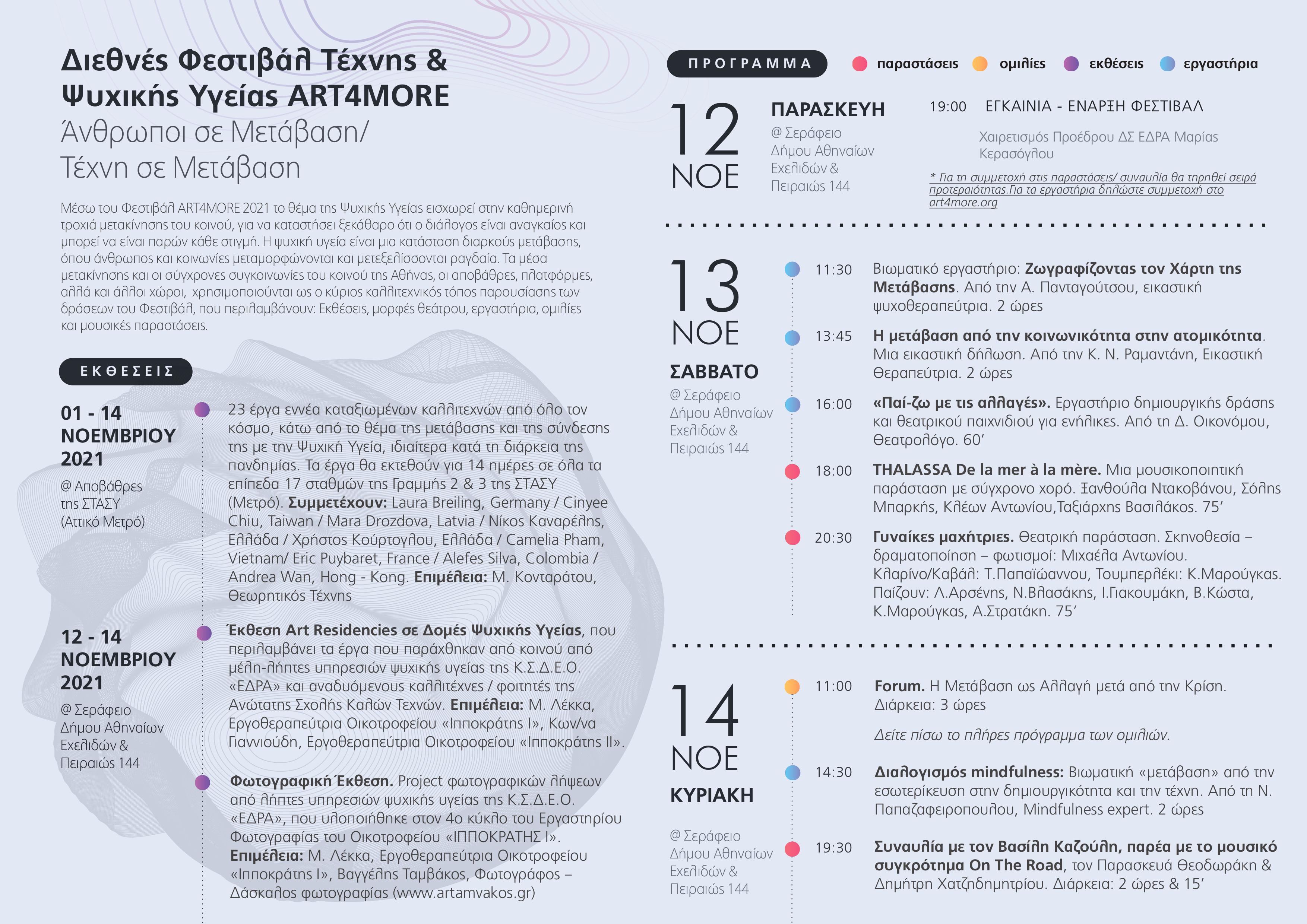 Μέσω του Φεστιβάλ ART4MORE 2021 το θέμα της Ψυχικής Υγείας εισχωρεί στην καθημερινή τροχιά μετακίνησης του κοινού, για να καταστήσει ξεκάθαρο ότι ο διάλογος είναι αναγκαίος και μπορεί να είναι παρών κάθε στιγμή. Η ψυχική υγεία είναι μια κατάσταση διαρκούς μετάβασης, όπου άνθρωπος και κοινωνίες μεταμορφώνονται και μετεξελίσσονται ραγδαία. Τα μέσα μετακίνησης και οι σύγχρονες συγκοινωνίες του κοινού της Αθήνας, οι αποβάθρες, πλατφόρμες, αλλά και άλλοι χώροι, χρησιμοποιούνται ως ο κύριος καλλιτεχνικός τόπος παρουσίασης των δράσεων του Φεστιβάλ, που περιλαμβάνουν: Εκθέσεις, μορφές θεάτρου, εργαστήρια, ομιλίες και μουσικές παραστάσεις.